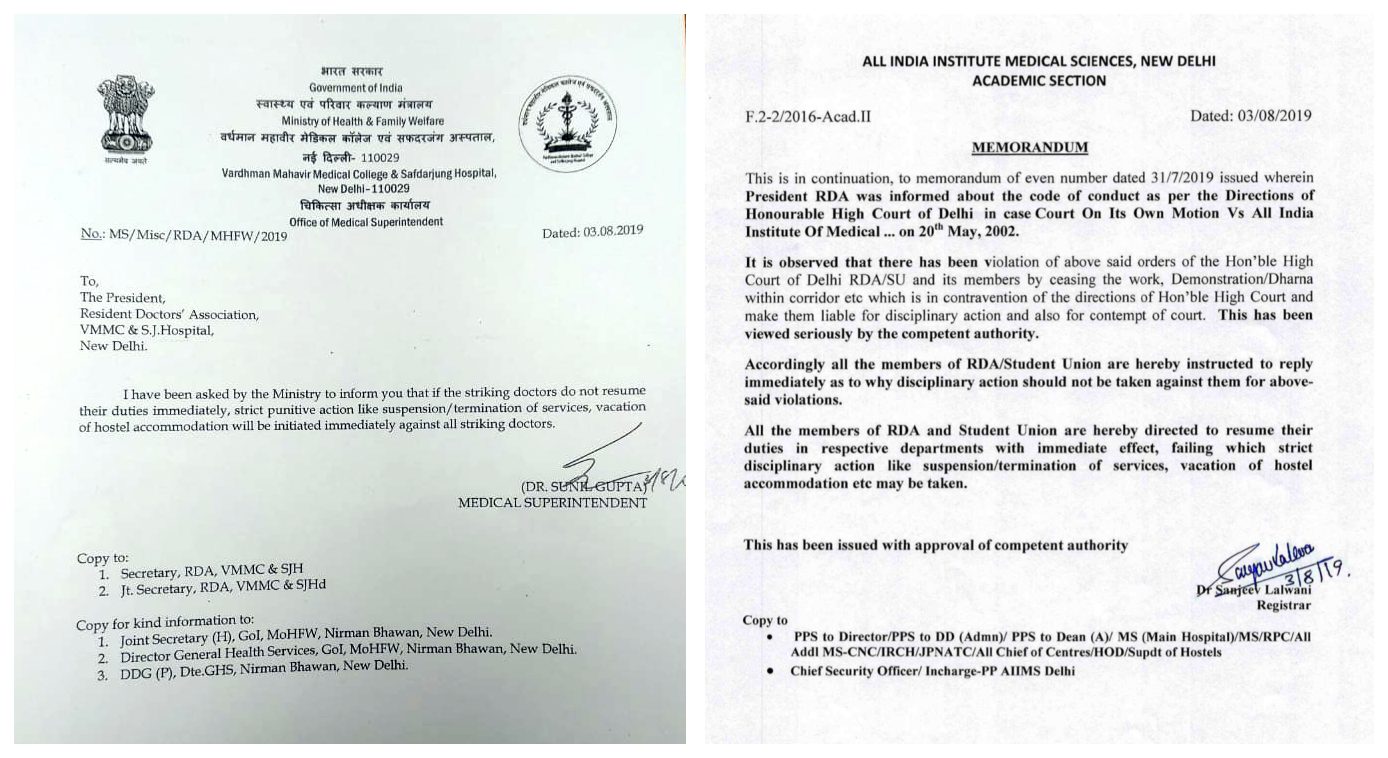 AIIMS and Safdarjung hospital in Delhi warned striking doctors a strict punitive and disciplinary action against them for their suspension/termination of services, vacation of hostel accommodation, if they do not resume their duties with immediate effect.