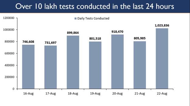India has conducted 1 million tests in the past 24 hours having a determined, focused, consistent and coordinated efforts of the Centre and the State/UT governments. With 10,23,836 tests done yesterday, India has achieved its resolve to test 1 million samples daily.